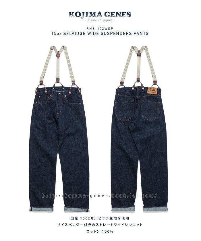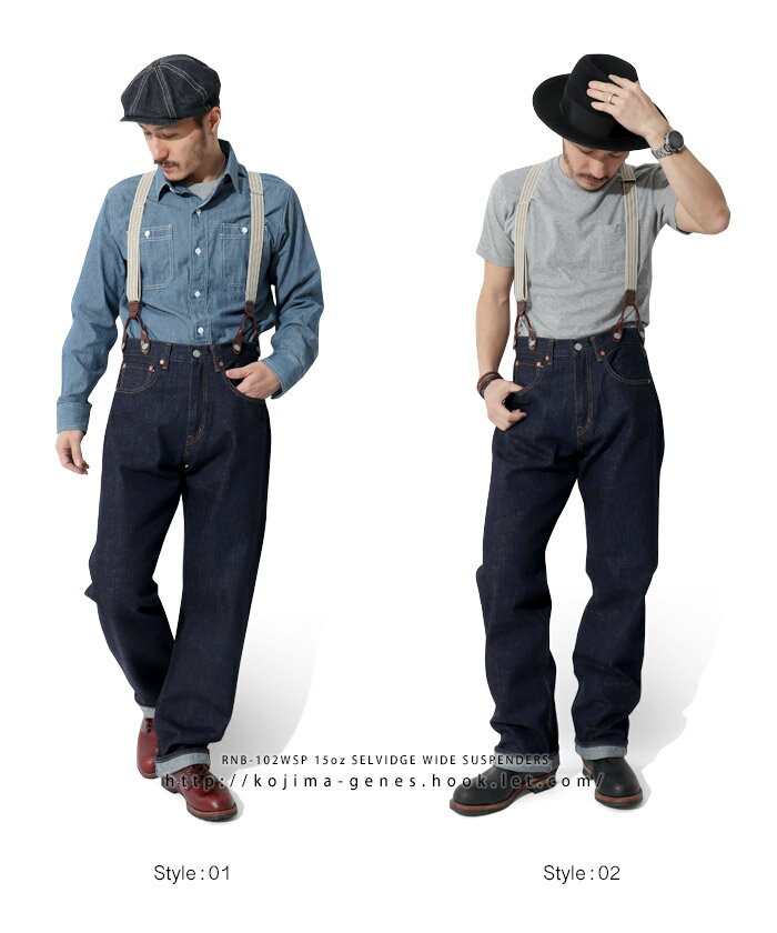 程よい厚みの15ozセルビッチ生地を使用した男らしいワイドシルエットのジーンズにサスペンダーがついたヴィンテージライクな雰囲気のアイテム。