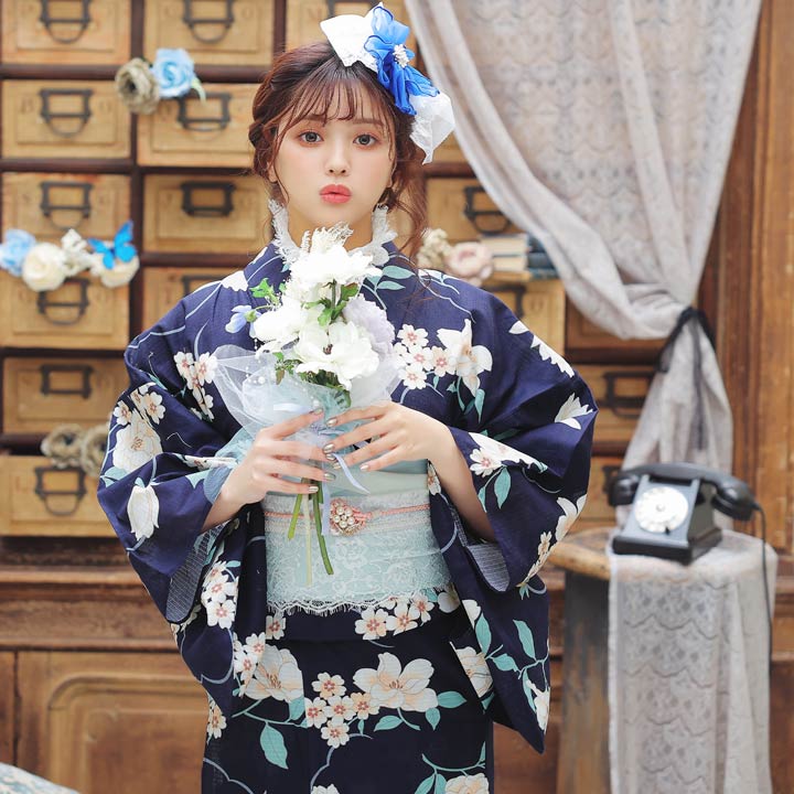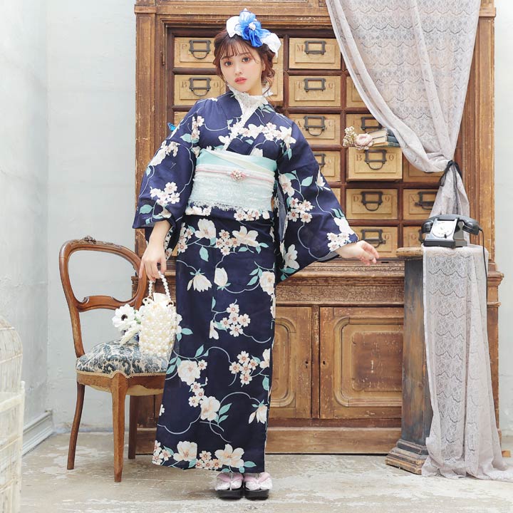 【送料無料】 浴衣 セット 紺地 木蓮 柄 浴衣 帯 下駄 3点 セット [YUKATA by dazzy]| 浴衣 レディース 浴衣 大人 浴衣 帯 2020 新作 浴衣 平帯 リバーシブル帯 女性用 大人用 和装 和服 和装小物 花柄 フリーサイズ